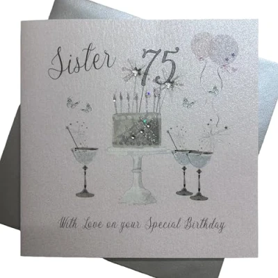 WHITE COTTON CARDS Happy 75th Birthday Card Sister Champagne Glasses Pink Roses SS42 S75,16cm x 16cm