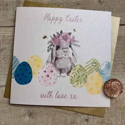 WHITE COTTON CARDS HOPPY EASTER EGGS BUNNY & BEES CARD, HAND FINISHED (E24 4)