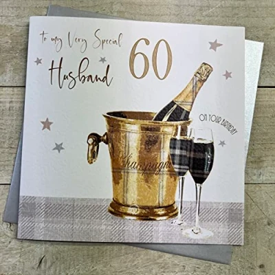 WHITE COTTON CARDS HUSBAND 60TH, GOLD CHAMPS LARGE BIRTHDAY CARD, HAND FINISHED (XS353 H60)