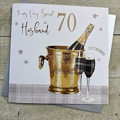 WHITE COTTON CARDS HUSBAND 70TH, GOLD CHAMPS LARGE BIRTHDAY CARD, HAND FINISHED (XS353 H70)