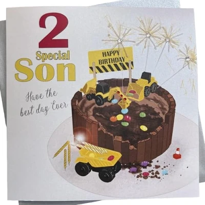 WHITE COTTON CARDS Large, Special Son Happy 2 Diggers and Trucks Handmade 2nd Birthday Card, XNA2 S