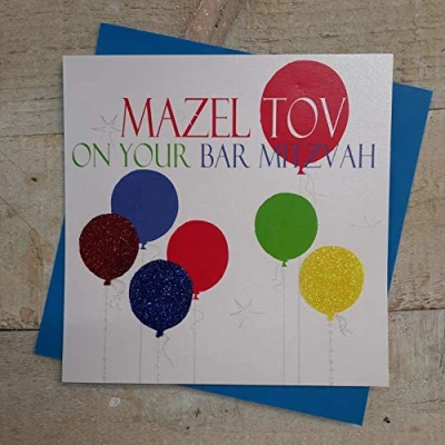WHITE COTTON CARDS Mazel Tov, Handmade Bar Mitzvah Card, Code N326 (Neon Balloons)