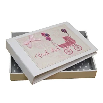 Beautiful handmade pink pram photo album Presented in a white gift box with a clear perspex lid Includes 16 pockets to hold up to 32 photos Hand finished with gorgeous diamantes. The perfect gift for your special occasion