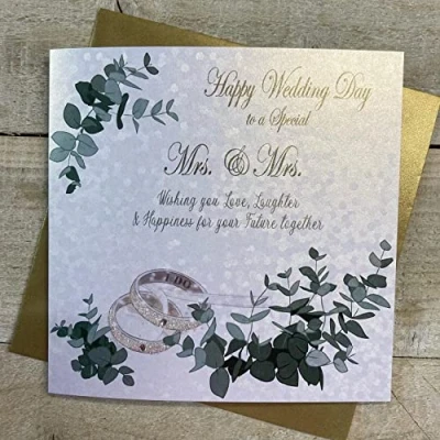 WHITE COTTON CARDS MRS. & (SAME SEX) RINGS GREENERY DESIGN, WEDDING CARD, HAND FINISHED (VN155 MRS)