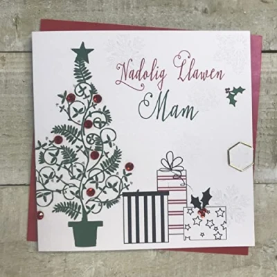 WHITE COTTON CARDS Nadolig Llawen Mam Tree & Presents Welsh Christmas Card, Handmade WFP11