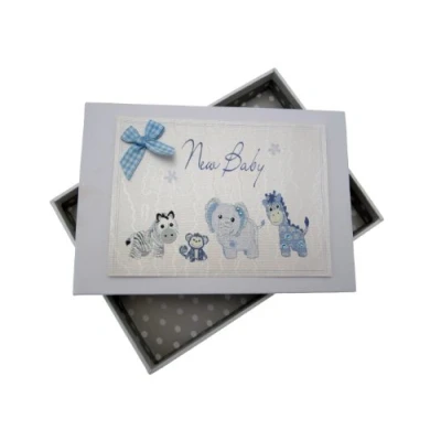 Beautiful handmade New Baby Blue Toys photo album Presented in a white gift box with a clear perspex lid Includes 16 pockets to hold up to 32 photos Hand finished with gorgeous diamantes and sparkling glitter The perfect gift for your special occasion