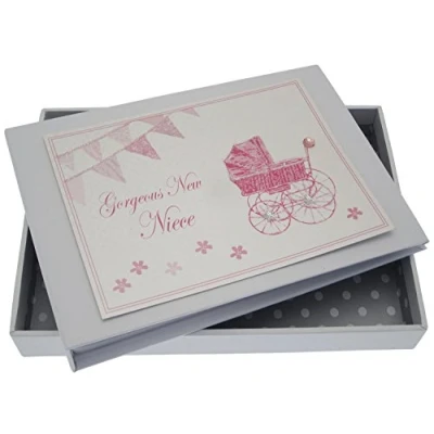 Beautiful handmade New Niece Pink Pram & Bunting photo album Presented in a white gift box with a clear perspex lid Includes 16 pockets to hold up to 32 (6"X 4") photos Hand finished with gorgeous diamantes and sparkling glitter The perfect gift for your special occasion