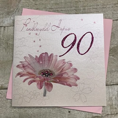 White Cotton Cards Penblwydd Hapus 90 Gerbera Welsh Birthday Card, Handmade (WWBA90)