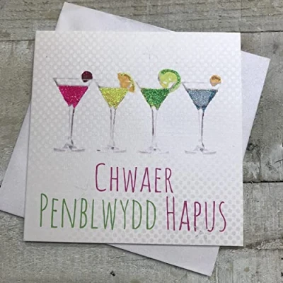 WHITE COTTON CARDS Penblwydd Hapus Chwaer Cocktail Glasses Welsh Birthday Card, Handmade (WN300C)