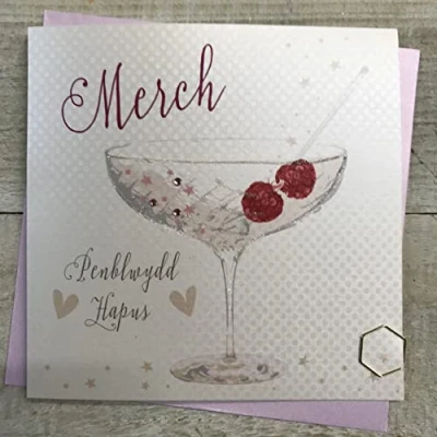 WHITE COTTON CARDS Penblwydd Hapus Merch Cocktail Glass Welsh Birthday Card, Handmade (WE B114)
