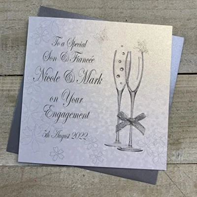 White Cotton Cards PERSONALISED ENGAGEMENT CARD. ANY RELATION. SON & FIANCÉE. CHAMPAGNE FLUTES DESIGN. Handmade (P22 34 S XP22 S)