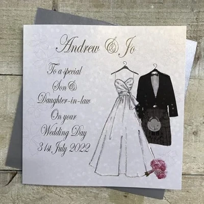 WHITE COTTON CARDS PERSONALISED WEDDING CARD SPECIAL SON & DAUGHTER IN LAW KILT DRESS DESIGN. Handmade (PPS146 S XPPS146 S)