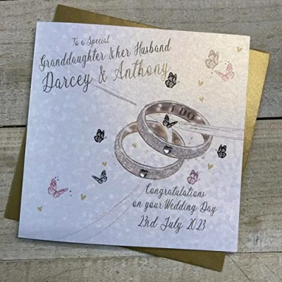 White Cotton Cards PERSONALISED WEDDING CARD, TO A SPECIAL GRANDDAUGHTER & HUSBAND, RINGS DESIGN, HAND FINISHED (X) P23 9 GD