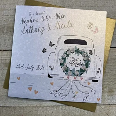 WHITE COTTON CARDS PERSONALISED WEDDING CARD, TO A SPECIAL NEPHEW & WIFE, CAR DESIGN, HAND FINISHED (X) P23 8 NEP