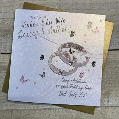 WHITE COTTON CARDS PERSONALISED WEDDING CARD, TO A SPECIAL NEPHEW & WIFE, RINGS DESIGN, HAND FINISHED (X) P23 9 NEP