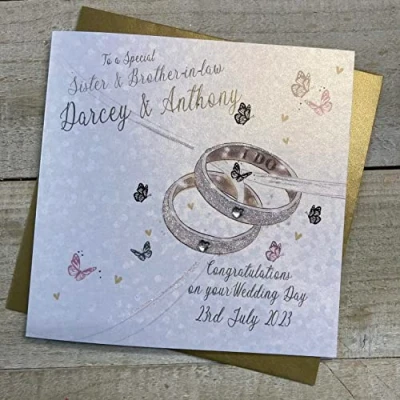 WHITE COTTON CARDS PERSONALISED WEDDING CARD, TO A SPECIAL SISTER & BROTHER IN LAW, RINGS DESIGN, HAND FINISHED (X) P23 9 SB