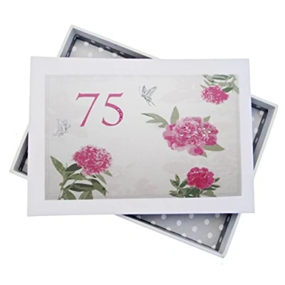 Beautiful handmade 75th Birthday English Roses photo album Presented in a white gift box with a clear perspex lid Includes 16 pockets to hold up to 32 (6"X 4") photos Hand finished with gorgeous diamantes and sparkling glitter The perfect gift for your special occasion