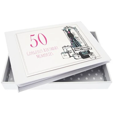 Beautiful handmade 50th Birthday Evening Dress photo album Presented in a white gift box with a clear perspex lid Includes 16 pockets to hold up to 32 (6"X 4") photos Hand finished with gorgeous diamantes and sparkling glitter The perfect gift for your special occasion
