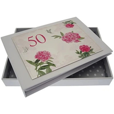 Beautiful handmade 50th Birthday English Roses photo album Presented in a white gift box with a clear perspex lid Includes 16 pockets to hold up to 32 (6"X 4") photos Hand finished with gorgeous diamantes and sparkling glitter The perfect gift for your special occasion
