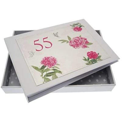 Beautiful handmade 55th Birthday English Roses photo album Presented in a white gift box with a clear perspex lid Includes 16 pockets to hold up to 32 (6"X 4") photos Hand finished with gorgeous diamantes and sparkling glitter The perfect gift for your special occasion