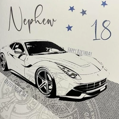 WHITE COTTON CARDS Racing Car, Nephew 18 Happy Handmade 18th Birthday Card, White, WBA18C N, 16cm x
