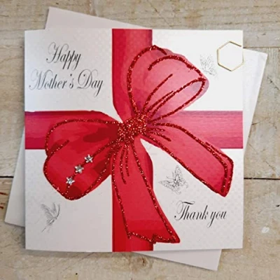 WHITE COTTON CARDS Red Bow Happy Thank You Handmade Mother's Day Card, White, MD13