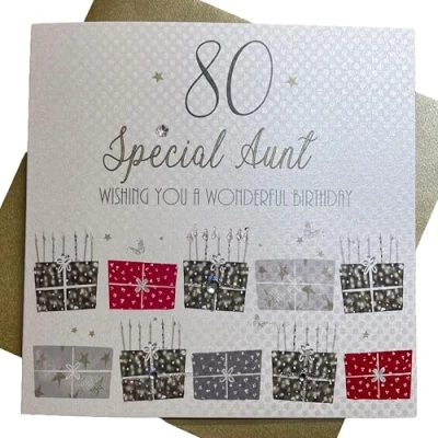 WHITE COTTON CARDS Red Present, Wishing you a Wonderful Aunt Handmade 80th Birthday Card, White, bdp80 aunt,16cm x 16cm