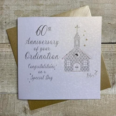 WHITE COTTON CARDS SILVER CHURCH, 60TH ANNIVERSARY ORDINATION CARD, HAND FINISHED (D179 60)