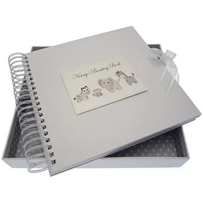 Beautiful handmade Nanny's Boasting Book Silver Toys card & memory book Spiral bound allowing the book to expand and be filled with cards and other special memories Includes approximately 40 blank pages and presented in a white gift box with a lid Hand finished with gorgeous diamantes and sparkling glitter The perfect gift for your special occasion