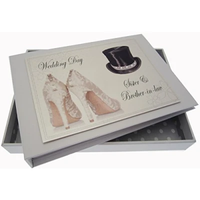 Beautiful handmade Sister & Brother-in-Law Wedding Day Top Hat & Shoes photo album Presented in a white gift box with a clear perspex lid Includes 16 pockets to hold up to 32 (6"X 4") photos Hand finished with gorgeous diamantes and sparkling glitter The perfect gift for your special occasion