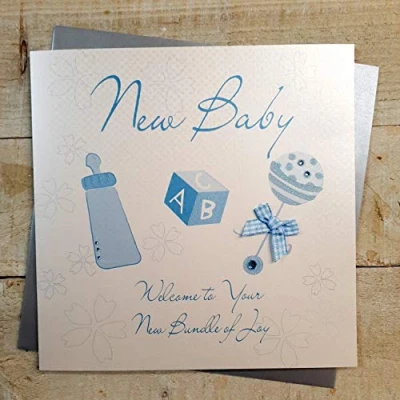WHITE COTTON CARDS Welcome Bundle of Joy, Handmade New Baby Large Card (Blue Rattle Design)