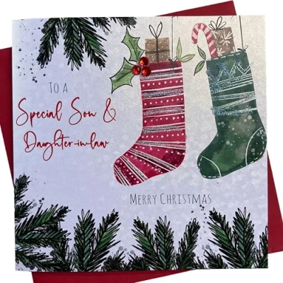 White cotton cards X146 Merry Christmas To a Special Son and Daughter In Law Handmade Card with Bunting Design,