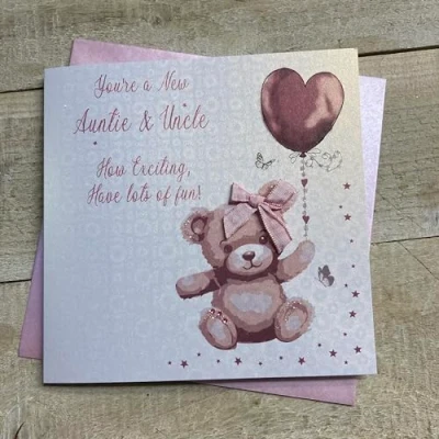 WHITE COTTON CARDS YOU'RE A NEW AUNTIE & UNCLE HOW EXCITING, HAVE LOTS OF FUN Hand Finished Card TEDDY BEAR PINK B265