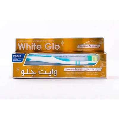 Premium fluoride enriched toothpaste specially formulated with Diatomaceous Earth to remove tobacco stains and help eliminate smokers breath Micro Polishing Particles to remove discolourations and yellowing on tooth enamel caused by cigarette smoking & strong coloured food/drinks Fluoride protection against cavities. Low Abrasion - safe for daily use Free whitening toothbrush and dental flosser with each pack Effective whitening formula from White Glo - Australia's rated number one most effective whitening