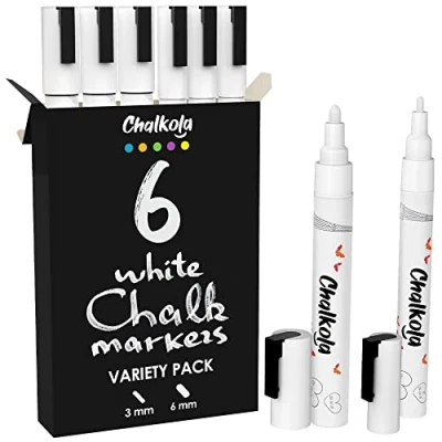 3mm | 6mm - Set of 6 white chalk markers (thin and thick point). Time to replace the old dusty chalk with white chalk ink marker THE ULTIMATE FREEDOM OF EXPRESSION - Chalkola’s chalk paint markers are great to decorate wedding signs, shop storefront, milestone boards, menus, LED boards, contact paper, car mirrors, chalk lettering. MADE FOR EVERYONE - Whether you're a Teacher, Mom, Student, Artist, Kid, Business, Office or Restaurant Owner our white liquid chalk ink markers make creating beautiful messages effortless. COMES OFF EASY - Our water-based ink is washable and delivers smudge free lines. A mere wipe of a wet paper towel will remove your finished ink from any non-porous surface & the ink is Permanent on porous surfaces MESS FREE - Dustless, non-toxic formula is both eco-friendly and safe for use at home.