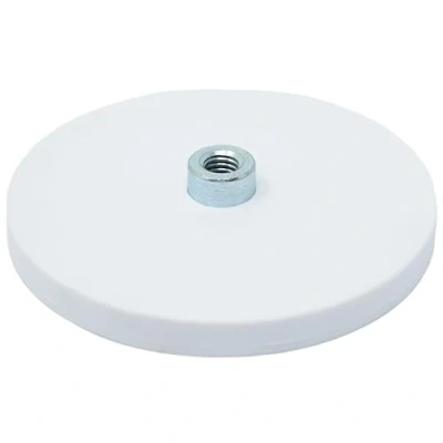 White Rubber Coated POS Magnet Countersunk with M8 External Thread for Retail Fixing and Holding Heavy Objects 88mm dia x 8mm high 45kg Pull