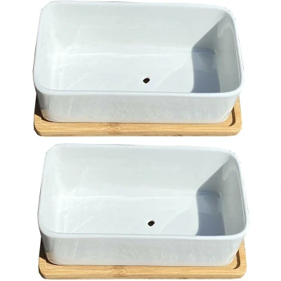 General description These interesting little pots are perfect for small tabletop plants and cacti. The glossy finish of the ceramic gives these pots an elegant look, making them suitable for any table or mantelpiece. Each pot comes with its own wooden potholder/tray, allowing you to display your succulents in style. These delightful plant pots also make great gifts. Technical specifications Dimensions: 9cm L x 17cm W x 7cm H Material: White ceramic with a glossed finish Designed for small tabletop plants Type: Succulent trough pot planter Set of 2