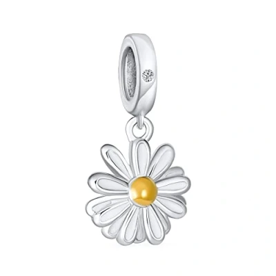 White Sunflower Daisy Flower Dangling Bead Charm For Women Mother Two Tone Enamel Gold Plated .925 Sterling Silver Fits European Bracelet