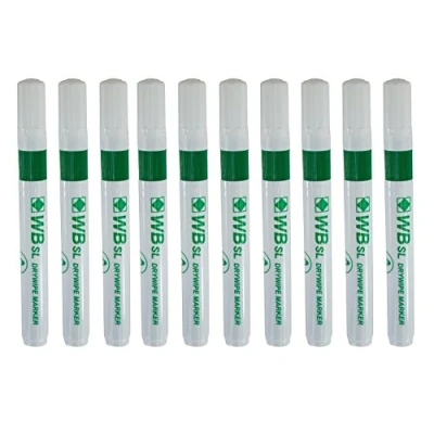 Whiteboard marker pens. Bullet tip for constant line width. Writes on any dry-erase board surface. Chunky barrel for firm grip. Close-fit cap protects nib. Ink colour: Green. Pack of 10 pens.