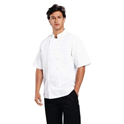 UNISEX FIT & STYLISH LOOK: The unisex design & classic white colourway offer a smart, professional look for any kitchen DOUBLE-BREASTED DESIGN: For extra protection against scalds & burns, plus the ability to reverse to hide stains COMFORTABLE SHORT SLEEVES: Keep staff cool in sweltering heats by offering excellent air circulation DURABLE 190g/m² POLYCOTTON MATERIAL: Making the jacket strong & long lasting, plus simple to care for & machine washable STAINLESS STEEL PRESS STUDS: Provide a secure & reliable fitting SUITABLE FOR COMMERCIAL LAUNDERING: For easy cleaning & keeping in perfect condition