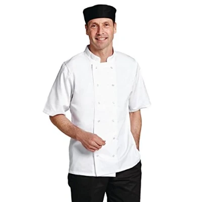 UNISEX FIT & STYLISH LOOK: The unisex design & classic white colourway offer a smart, professional look for any kitchen DOUBLE-BREASTED DESIGN: For extra protection against scalds & burns, plus the ability to reverse to hide stains COMFORTABLE SHORT SLEEVES: Keep staff cool in sweltering heats by offering excellent air circulation DURABLE 190g/m² POLYCOTTON MATERIAL: Making the jacket strong & long lasting, plus simple to care for & machine washable STAINLESS STEEL PRESS STUDS: Provide a secure & reliable fitting SUITABLE FOR COMMERCIAL LAUNDERING: For easy cleaning & keeping in perfect condition