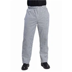 Waist size: 42"-44". Inseam: 33". polycotton - 65% polyester, 35% cotton. Patterned. Black and white check design reduces the visibility of stains and spills. Suitable for commercial laundering for easy cleaning. Suitable for commercial laundering.