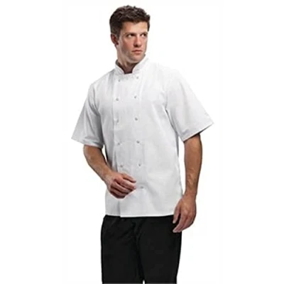 UNISEX FIT & STYLISH LOOK: The unisex design & classic white colourway offer a smart, professional look for any kitchen DOUBLE-BREASTED DESIGN: For extra protection against scalds & burns, plus the ability to reverse to hide stains COMFORTABLE SHORT SLEEVES: Keep staff cool in sweltering heats by offering excellent air circulation DURABLE 190g/m² POLYCOTTON MATERIAL: Making the jacket strong & long lasting, plus simple to care for & machine washable STAINLESS STEEL PRESS STUDS: Provide a secure & reliable fitting SUITABLE FOR COMMERCIAL LAUNDERING: For easy cleaning & keeping in perfect condition