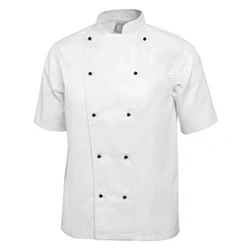 Chest Size: 44"-46" / 112cm-117cm. Polycotton - 80% polyester, 20% cotton. White. Breathable polycotton construction, which helps staff stay cool. The double-breasted design also adds a professional look.