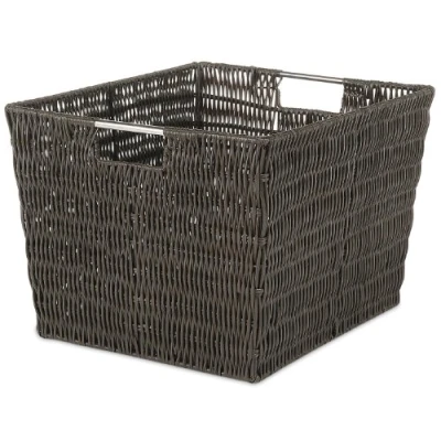Looks like rattan, wears like resin Easy clean Woven plastic Integrated handles Stylish organization