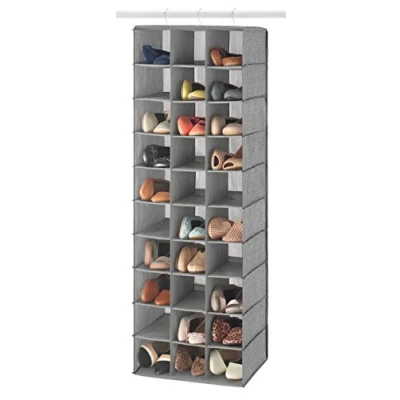 Whitmor's Hanging Shoe Shelf neatly stores and organizes 30 pairs of shoes without taking up any additional floor space Perfect for organizing bedrooms, closets, laundry room, play room, college dorm rooms Made to last; strong yet breathable fabric; reinforced seams for additional strength and support Quick set up; metal hooks hang from closet rod or garment rack.Use for small items like folded clothes, lingerie, socks, office supplies, makeup, toys, pet supplies, and more.Sturdy steel frame International products have separate terms, are sold from abroad and may differ from local products, including fit, age ratings, and language of product, labeling or instructions.