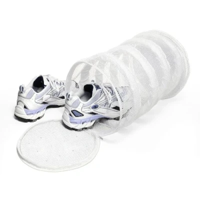 Loops allow bag to hang on rod for drying Soft mesh body helps protect the shoes and the washing machine Holds one pair of shoes up to a men's size 14 Zipped in this Wash Bag, your sneakers aren't left to tumble around in the washer and wrap around the agitator or snag other clothes. Mesh fabric lets water circulate through so the shoes get the cleaning power they need while keeping shoes separate. Two loops make it easy to hang from a rod or clothes line for air drying..Dimensions 14" x 9"