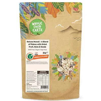 ✔ A WORLD OF GOODNESS: In a world full of fad diets, quick bites, and intricate recipes, don’t forget about the wonders of simple, nourishing food. We actively seek sustainable sources for our goods, asking our suppliers the tough questions that we know matter to our customers and making sure all our products are 100% GMO-Free. We follow strict hygiene processes to provide the best quality ingredients and have achieved a maximum of 5 Start food hygiene ratings. ✔ Deluxe Muesli - A Blend of Flakes with Dried Fruit, Nuts & Seeds: Our Deluxe Muesli is a perfectly made combination of Oatflakes, Fruits, and Nuts, including Almonds and Hazelnuts! It's also simple to add more ingredients to the muesli, enhancing the taste and nutrition while personalising it to your individual needs and dietary restrictions. What more could you want as the day begins? ✔ HIGH-QUALITY INGREDIENTS: It's also a good source of antioxidants, and protein, thanks to its high fruit and nut content. It undoubtedly improves and supports your digestive system because of its high fibre and whole grain content. The Muesli is also incredibly filling, so you get more bang for your buck, making it a useful tool for weight control, or more especially, hunger control. GMO-free Deluxe Muesli is suitable for Vegans. ✔ INSTRUCTION FOR USE: COLD WITH YOGURT. For a quick snack on the go, stir muesli in with your favourite yogurt. COLD WITH MILK. Pour milk over your muesli. HOT ON STOVETOP. Mix 1/3 cup muesli with 1/3 cup of water or milk and, stirring occasionally, bring to a boil, then remove from heat and let cool. ✔ JUST THE GOOD STUFF / FULLY RECYCLABLE PACKAGING: We believe that good food shouldn’t cost the earth, as such, sustainability matters to us dearly. That’s why we work tirelessly to find sustainable solutions throughout our business. We rolled out all-new 100% recyclable packaging on Wholefood Earth products. The new packaging is apt for kerbside recycling. ✔ OUR STORY: Thank you for knowing It's what's on the inside that counts. For wanting a future without toxins in the food your children eat. For protecting the biodiversity that nurtures animal habitats and makes crops thrive. From everyone here at Wholefood Earth, thank you for using your buying power to make meaningful, informed choices that will continue to nourish our people and our planet today, tomorrow, and forever. We're here for a healthier earth, sustainable earth, wholesome earth.