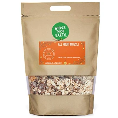 ✔ A WORLD OF GOODNESS: In a world full of fad diets, quick bites, and intricate recipes, don’t forget about the wonders of simple, nourishing food. We actively seek sustainable sources for our goods, asking our suppliers the tough questions that we know matter to our customers and making sure all our products are 100% GMO-Free. We follow strict hygiene processes to provide the best quality ingredients and have achieved a maximum of 5 Start food hygiene ratings. ✔ All Fruit Muesli - A Blend of Flakes with Dried Fruit: Our All-Fruit Muesli is a perfectly made combination of Wheat Flakes, Oats, Barley Flakes, Apricots, Dates, Figs, Raisins, Prunes, Jumbo Oats, Chopped Apple, Bran, Sunflower Oil, and Jumbo Oats. It's also simple to add more ingredients to the muesli, enhancing the taste and nutrition while personalising it to your individual needs and dietary restrictions. ✔ HIGH-QUALITY INGREDIENTS: It's also a good source of antioxidants, and protein, thanks to its high fruit and nut content. It undoubtedly improves and supports your digestive system because of its high fibre and whole grain content. The Muesli is also incredibly filling, so you get more bang for your buck, making it a useful tool for weight control, or more especially, hunger control. GMO-free All Fruit Muesli is suitable for Vegans. ✔ JUST THE GOOD STUFF / FULLY RECYCLABLE PACKAGING: We believe that good food shouldn’t cost the earth, as such, sustainability matters to us dearly. That’s why we work tirelessly to find sustainable solutions throughout our business. We rolled out all-new 100% recyclable packaging on Wholefood Earth products. The new packaging is apt for kerbside recycling. ✔ OUR STORY: Thank you for knowing It's what's on the inside that counts. For wanting a future without toxins in the food your children eat. For protecting the biodiversity that nurtures animal habitats and makes crops thrive. From everyone here at Wholefood Earth, thank you for using your buying power to make meaningful, informed choices that will continue to nourish our people and our planet today, tomorrow, and forever. We're here for a healthier earth, sustainable earth, wholesome earth.