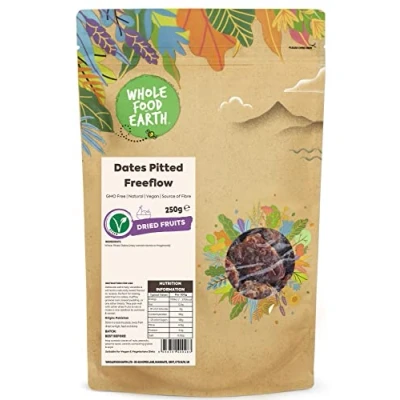 A World of Goodness: Wholefood Earth's Dates Pitted Freeflow - a delicious and versatile treat for all ages. These pitted dates, also known as stoned dates, are a delightful natural snack. Revered as the "tree of life," the date palm offers these sweet gems. Soft, sticky, and brimming with sweetness that rivals figs and prunes, these dates are a flavorful addition to a variety of dishes. Power-packed Dates are more than just a delicious snack; they pack a nutritional punch. Rich in dietary fiber, vitamins, and essential minerals, they're a wholesome addition to your daily diet. Some health experts recommend using a date a day into your eating routine to support overall well-being. With their high fiber content, dates promote healthy digestion and offer a gentle laxative effect, similar to prunes. Nutrient-rich superfood: Wholefood Earth's Dates Pitted Freeflow are 100% natural and pure. We bring you these stoned dates, carefully selected and packed for your enjoyment. Our commitment to quality ensures that you're getting the best nature has to offer. Instructions and Recipes: Incorporating these delightful dates into your diet is easy. They can be enjoyed as a snack on their own, or you can get creative and use them in various recipes. From sweetening smoothies and desserts to adding them to salads and oatmeal, the possibilities are endless. Explore the world of culinary delights with Wholefood Earth's Dates Pitted Freeflow. Just The Good Stuff / Fully Recyclable Packaging: Wholefood Earth is committed to sustainable practices, using fully recyclable packaging. This process involves efficient collection, and separation, followed by baling, shredding, and thorough washing. Materials are then melted and pelletized before being transformed into new packaging. This comprehensive approach minimizes waste and contributes to a healthier environment